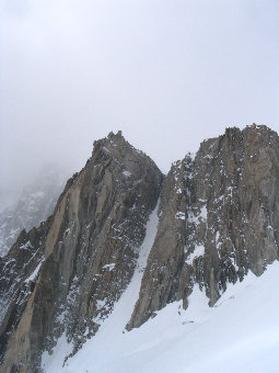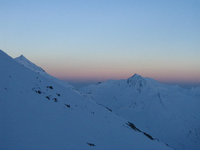 The "Haute Route" is a number of hut to hut and peak to peak routes between Chamonix (Mont Blanc) France and Zermatt (Matterhorn)/Saas Fee Switzerland. The Haute Route is the "classic" ski mountaineering tour as it encompasses 4,000 meter peaks, high passes, glacier skiing, ski ascents, and just about every snow /weather combination imagineable...In April 2004, I had the good fortune to add the "Haute Route" to my list of "gonzo abusive" adventures that I have survived! A memorable trip for its mountains, skiing , old friends and new acquaintences. Ruedi Beglinger insured that the adventure was maximized! Skins-on and Berg Heil!
