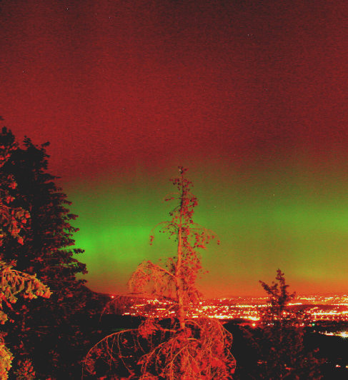 October 29, 2003 A brilliant display of the Northern Lights above Colorado Springs. Click here to view the white light filter photo of the sunspot that spawned this auroral display. Canon 10D, 24mm lens, 8 sec.