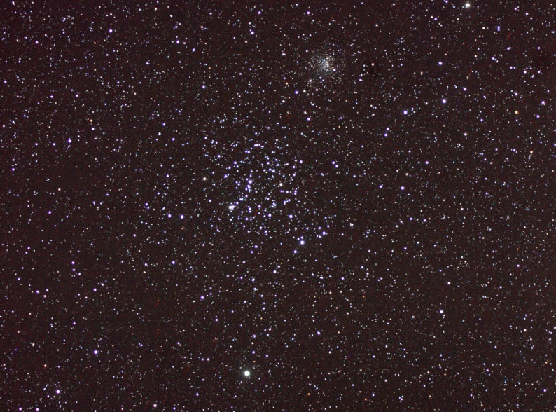 M35 is an open cluster that is visible to the unaided eye as a fuzzy patch at the left foot of Castor the western Gemini twin. M35 lies about 3 thousand light years away from Earth and is about 200 million years old. To the upper right of M35 cluster is the small cluster NGC 2158 which is some 13,000 light years away. Wide field photo is a stack of 6 x 4min exposues with a Pentax 105 SHDF APO with .8x reducer, IDAS light pollution filter, and Canon 10D. Colorado Springs, 2004