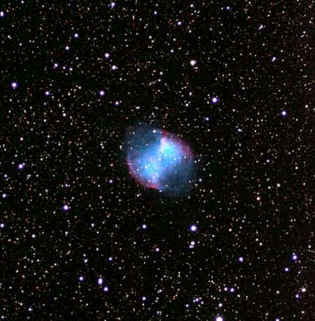 Dumbell Nebula M27. The Dumbell Nebula is a planetary nebula -the ionized gas of a dying star that is located in the constellation Vulpecula some 815 light years from earth. Technical: Canon10D at prime focus with A-P 178 f/9 APO. July 2006, Quandary Peak, CO