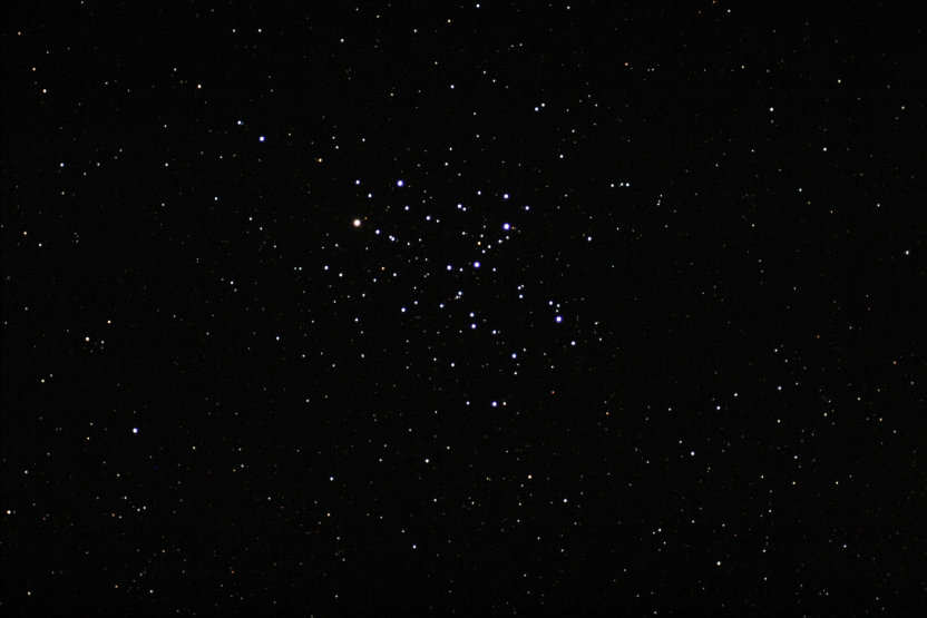 M6 The Butterfly Cluster in Scorpius. This open cluster is 1,585 light years from earth. It is visible to the unaided eye as a fuzzy spot at the end of the tail of Scorpius. With some (or alot) imagination, one can picture a butterfly (maybe) Hint: look for the "V" antennae in the middle of the photo.... In any case, its a fine summer evening sight in binoculars..... Brandon 130 f/8 APO, guided, with Canon 10D, June 2004 Rocky Mountain Star Stare, Lake George, CO.